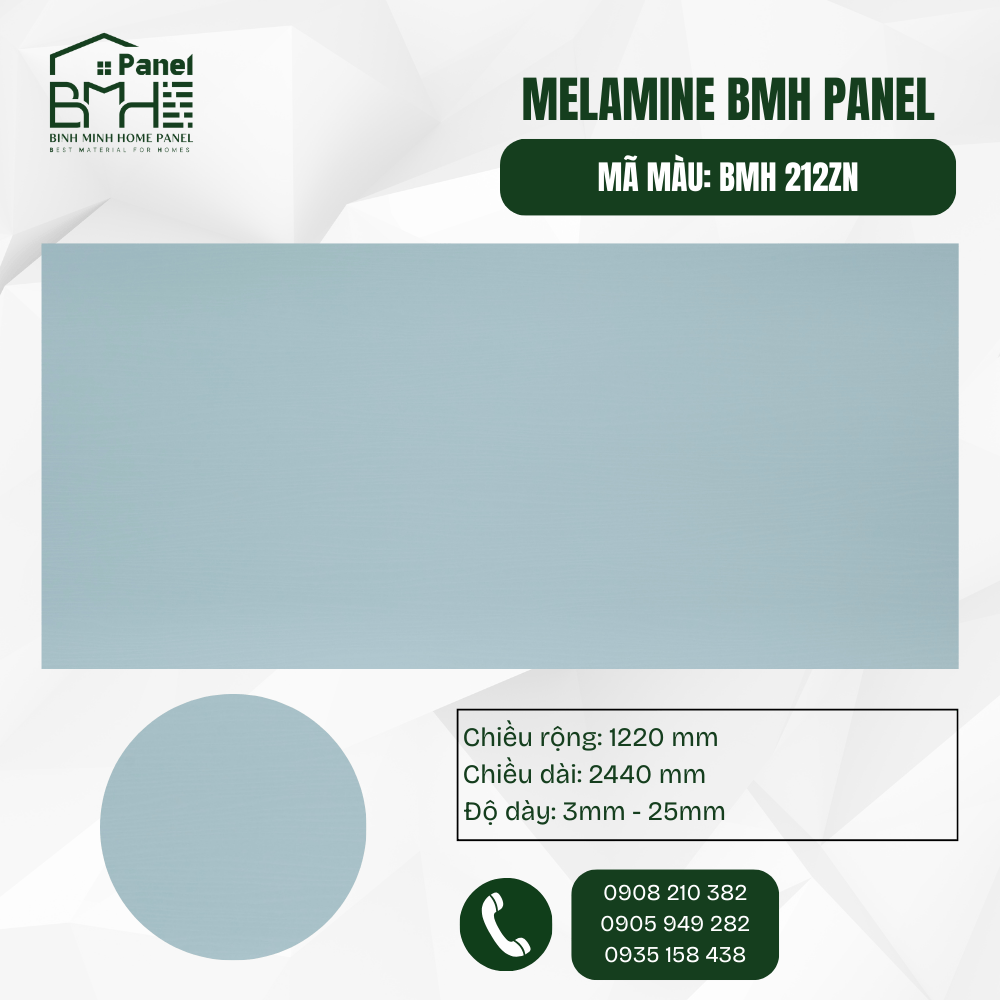 Mã BMH 212ZN sở hữu tông màu Xanh Ghi Pastel thanh lịch, kết hợp cùng bề mặt ZN (Zircon) mịn lì hiện đại. Đây là lựa chọn hoàn hảo cho các thiết kế nội thất đương đại, mang lại không gian sống bình yên, thư thái nhưng không kém phần đẳng cấp. Sản phẩm phù hợp làm tủ bếp, cánh tủ quần áo hoặc các mảng nhấn trang trí trong căn hộ.