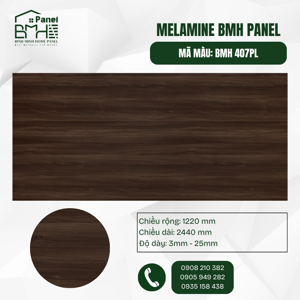 Mã màu BMH 407PL sở hữu tông Nâu Chocolate đậm đà, mô phỏng vẻ đẹp cổ điển của gỗ Phong Wyoming. Với bề mặt PL mịn lì chống bám bẩn và hệ vân gỗ chuyển màu tinh tế, sản phẩm là lựa chọn hoàn hảo để kiến tạo không gian nội thất sang trọng, ấm cúng và mang đậm dấu ấn cá nhân.