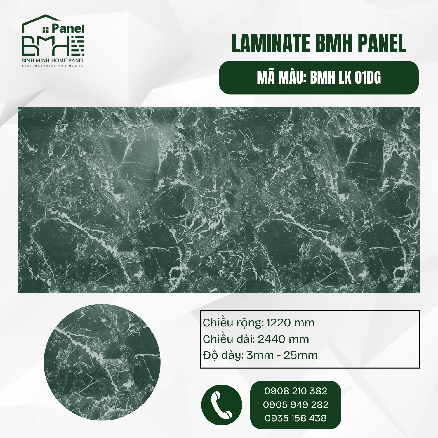 Laminate BMH là dòng sản phẩm bề mặt cao cấp bậc nhất, là một nhà sản xuất, BMH cam kết luôn cung cấp đầy đủ, kịp thời đến khách hàng. Mẫu Laminate 01DG mô phỏng dòng đá tự nhiên Verde Alpi (một loại đá cẩm thạch xanh nổi tiếng từ Ý).