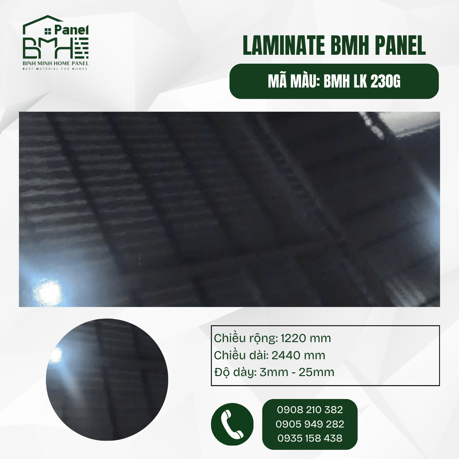 Mã 230G là "vua" của sự sang trọng (Luxury). Thường dùng làm mặt bàn, cánh tủ bếp, hoặc ốp vách TV để tạo độ tương phản mạnh mẽ với màu trắng hoặc vân gỗ.