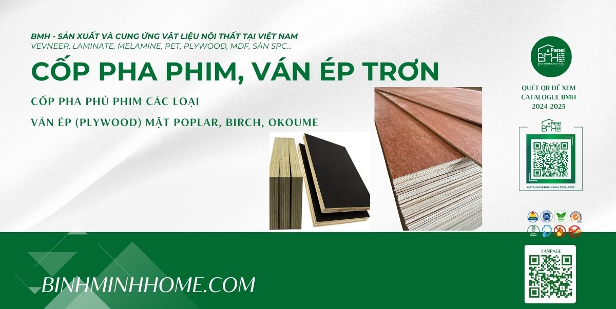 Cốp pha phim và ván ép trơn là những vật liệu quen thuộc trong ngành xây dựng và sản xuất nội thất. Với nhiều ưu điểm nổi bật như độ bền cao, dễ thi công và tiết kiệm chi phí, các sản phẩm này đang ngày càng được ứng dụng rộng rãi. Bài viết dưới đây sẽ cung cấp cho bạn thông tin chi tiết về các loại cốp pha phủ phim, ván ép trơn và các loại ván ép mặt poplar, birch và okoume.