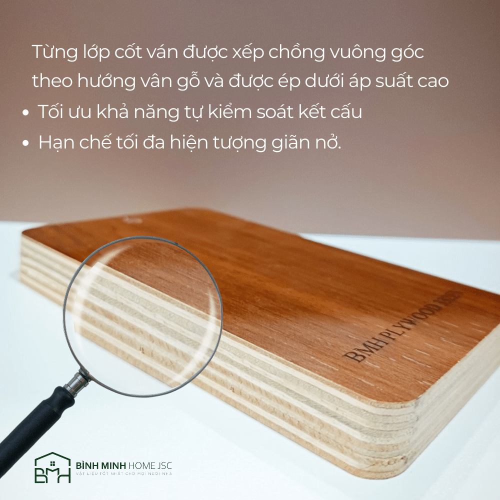 Đặc biệt Plywood do BMH cung ứng còn có khả năng kháng ẩm, chống trương nở tối đa sau 72h ngâm nước. Từng lớp cốt ván được lựa chọn chỉnh chu & bề mặt ép phẳng mịn.